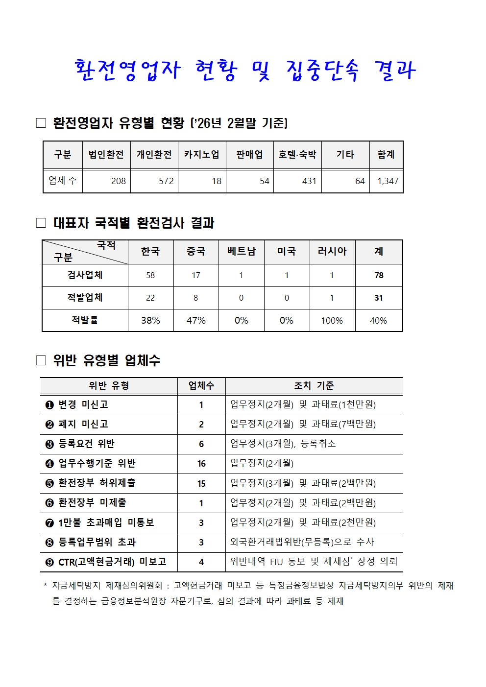 관세청, 환전영업자 불법행위 집중단속 결과 발표